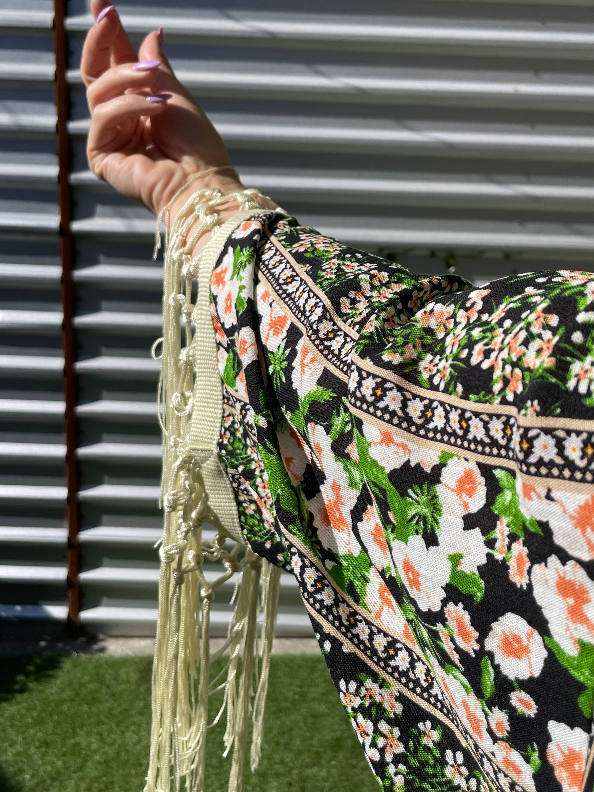 The Heron is a timeless, vintage-inspired robe designed with effortless elegance in mind. It features a graceful tulip hem that drapes beautifully, finished with delicate tassel fringe along the bottom hem and sleeves for a touch of charm and movement.